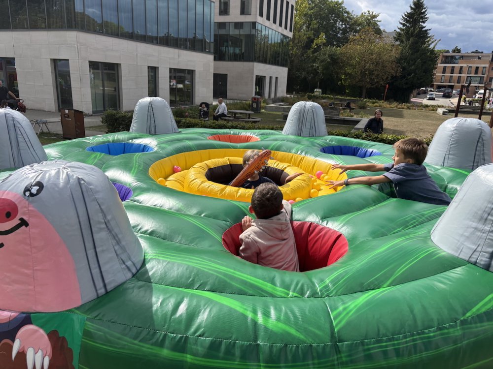 De "mollen" met de helm op, springen uit hun 'hol' en proberen zoveel mogelijk balletjes te grijpen. Maar pas op! De 'mollenvanger' staat klaar met een hamer om op de mollen te slaan.