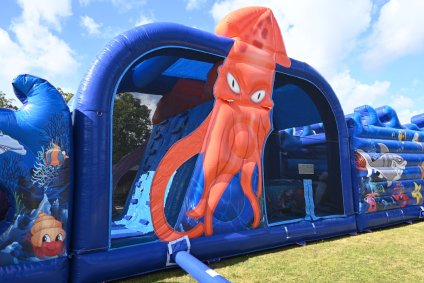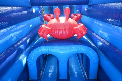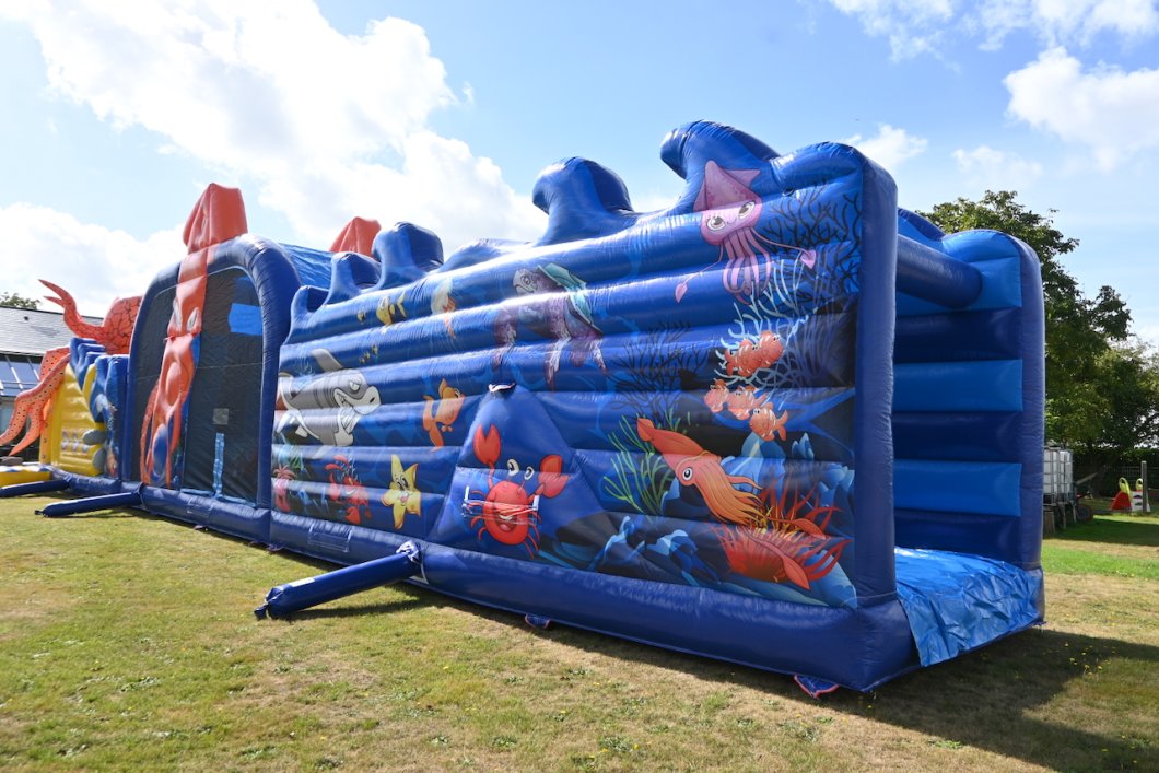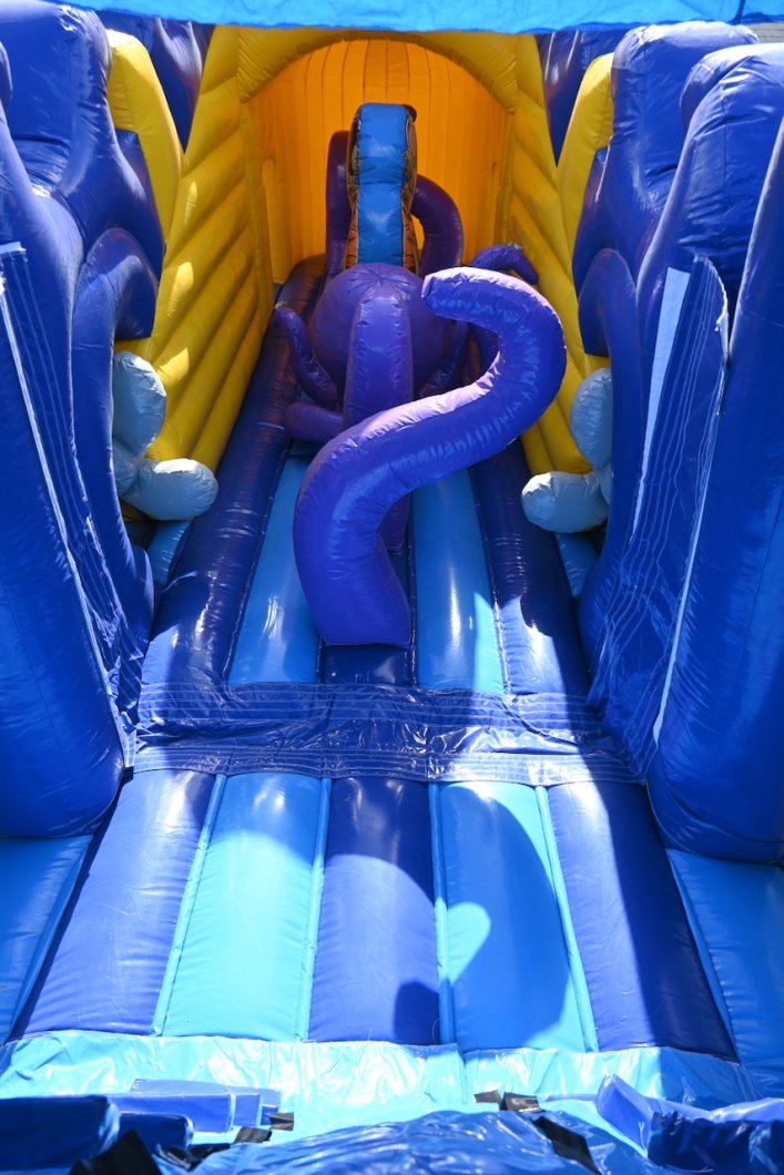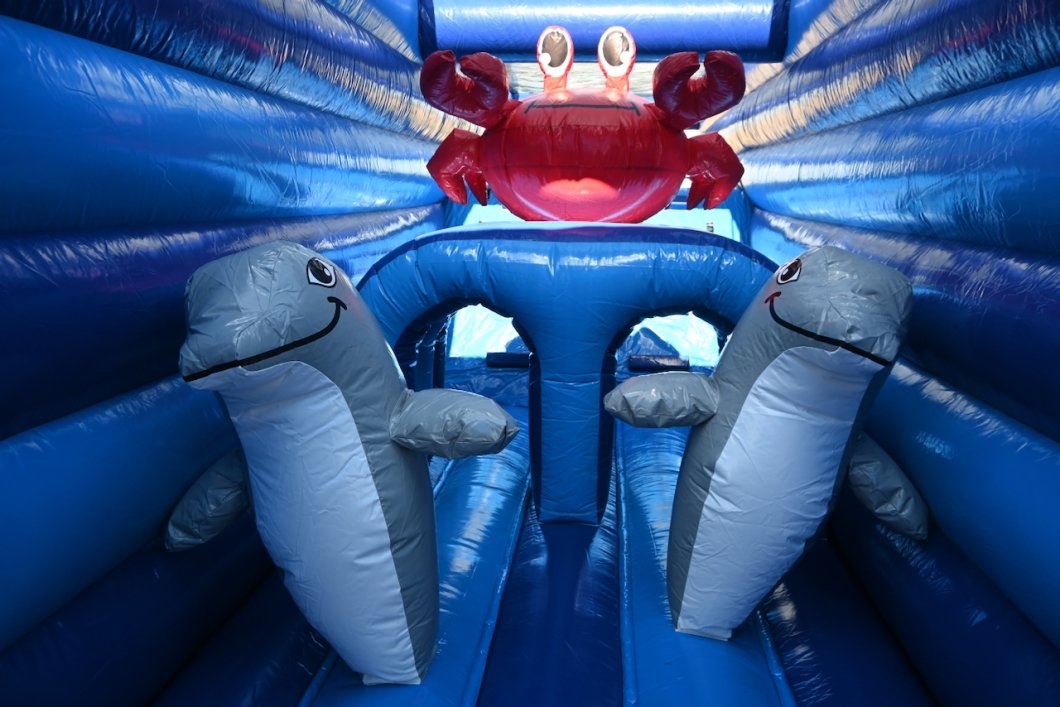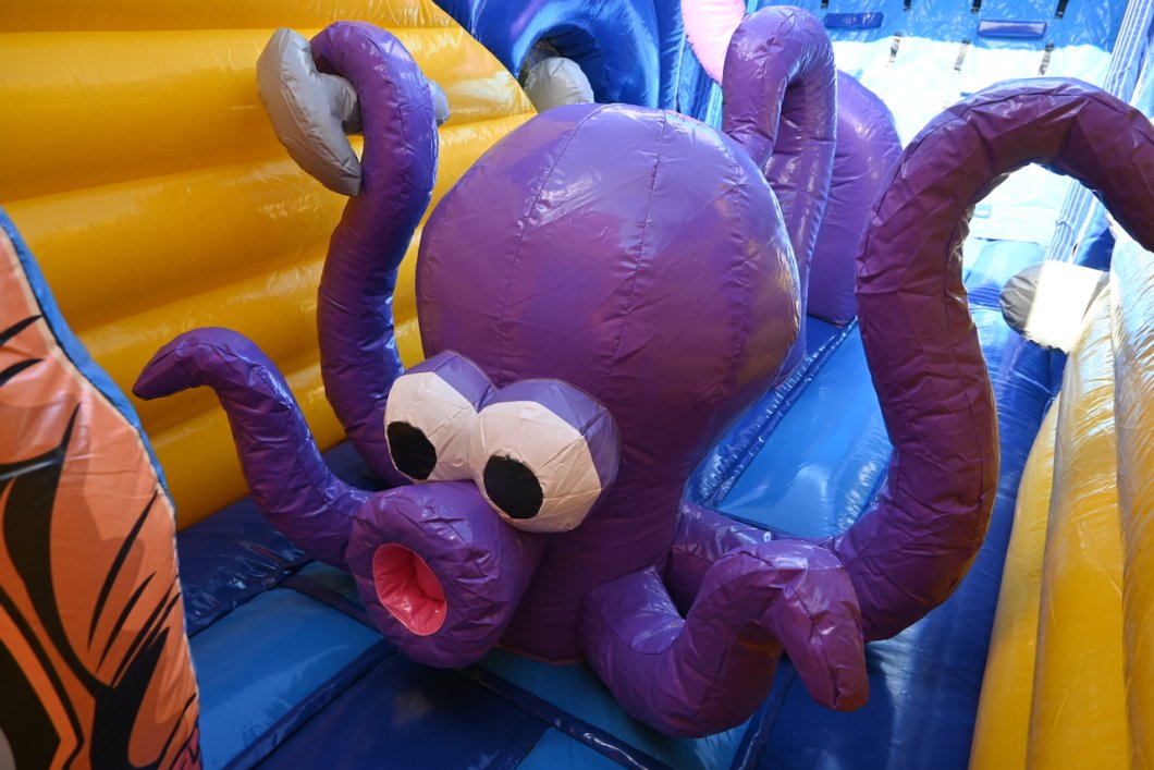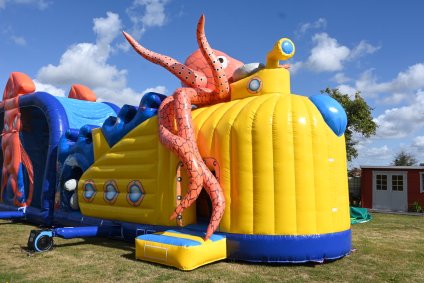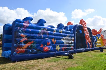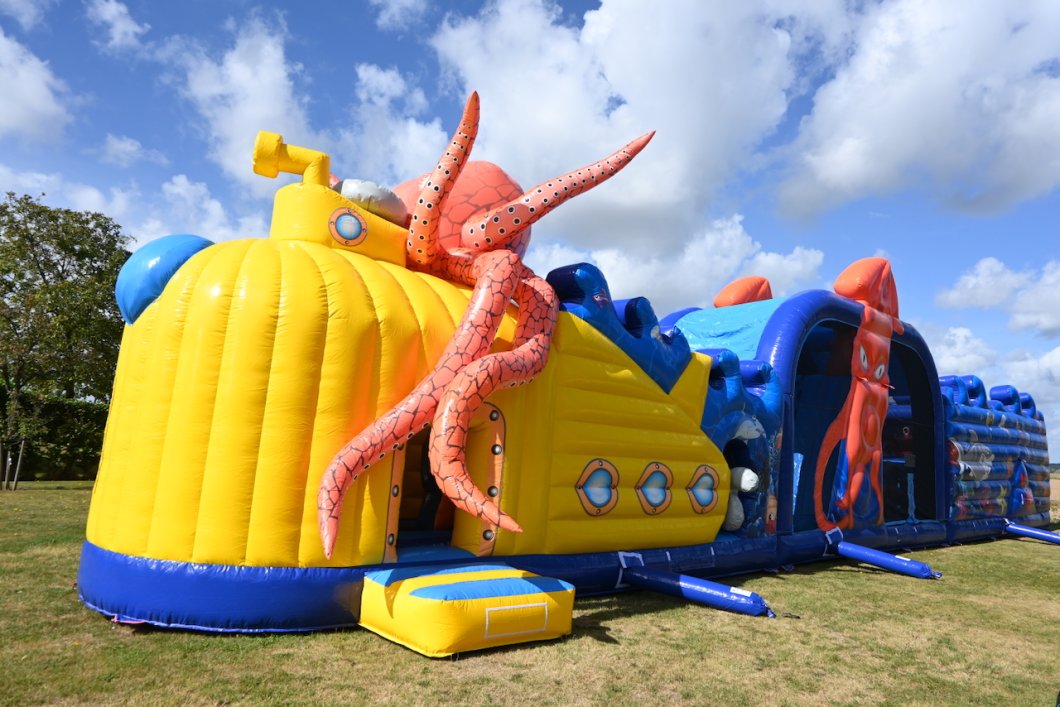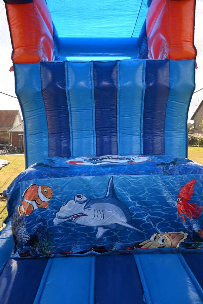 Duik mee onder water, maar pas op: dit springkasteel is niet voor 'doetjes'! Stap in de gele onderzeeër die je de diepte in voert, op weg naar avontuur! Een reuzen octopus legt haar tentakels rondom de onderzeeër. Kan jij uit haar greep blijven? Ren tussen de tentakels door, klim naar boven en spring van de 'PILLOW JUMP' de diepte in. Blijf uit de greep van de haaien, laat je begeleiden door de dolfijnen, duik onder de reuzenkrab en glij uiteindelijk de vrijheid tegemoet.